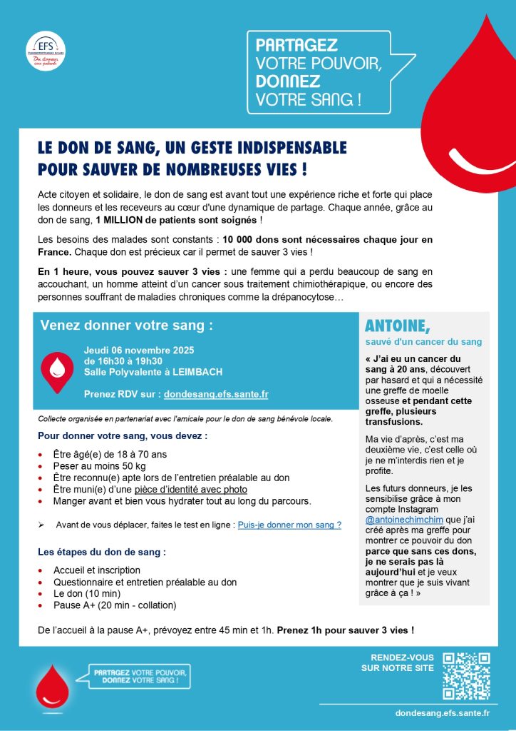DON DE SANG – JEUDI 6 NOVEMBRE 2025 de 16h30 à 19h30