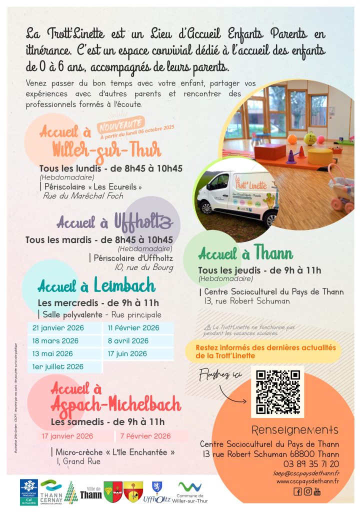 Il s’agit d’un Lieu d’Accueil Enfants Parents en itinérance qui interviendra sur Leimbach le mercredi matin, une fois par mois de 9h à 11h. L’accueil est gratuit sans inscription et anonyme.
