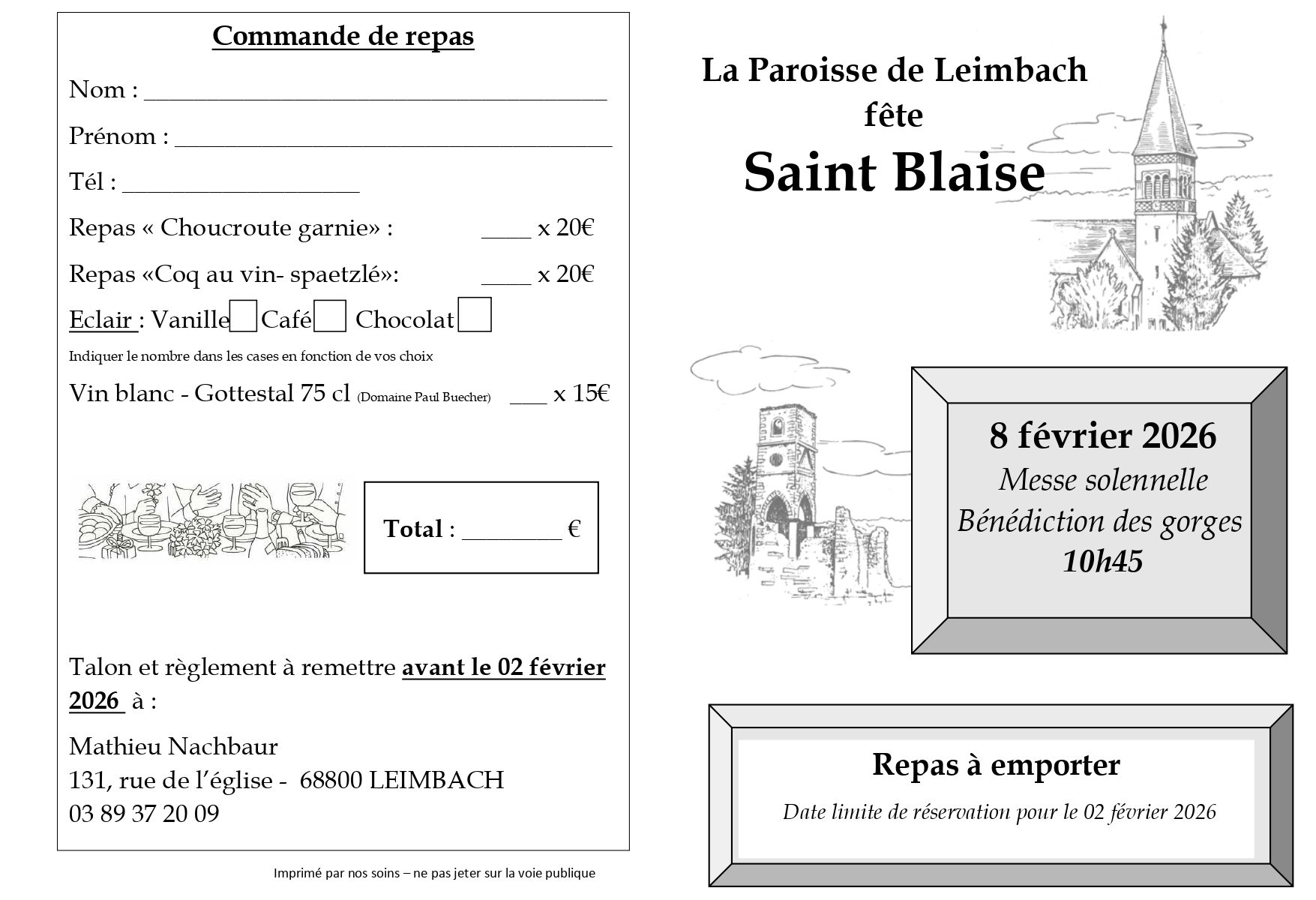 LA PAROISSE DE LEIMBACH FETE SAINT BLAISE – DIMANCHE 8 FEVRIER 2026