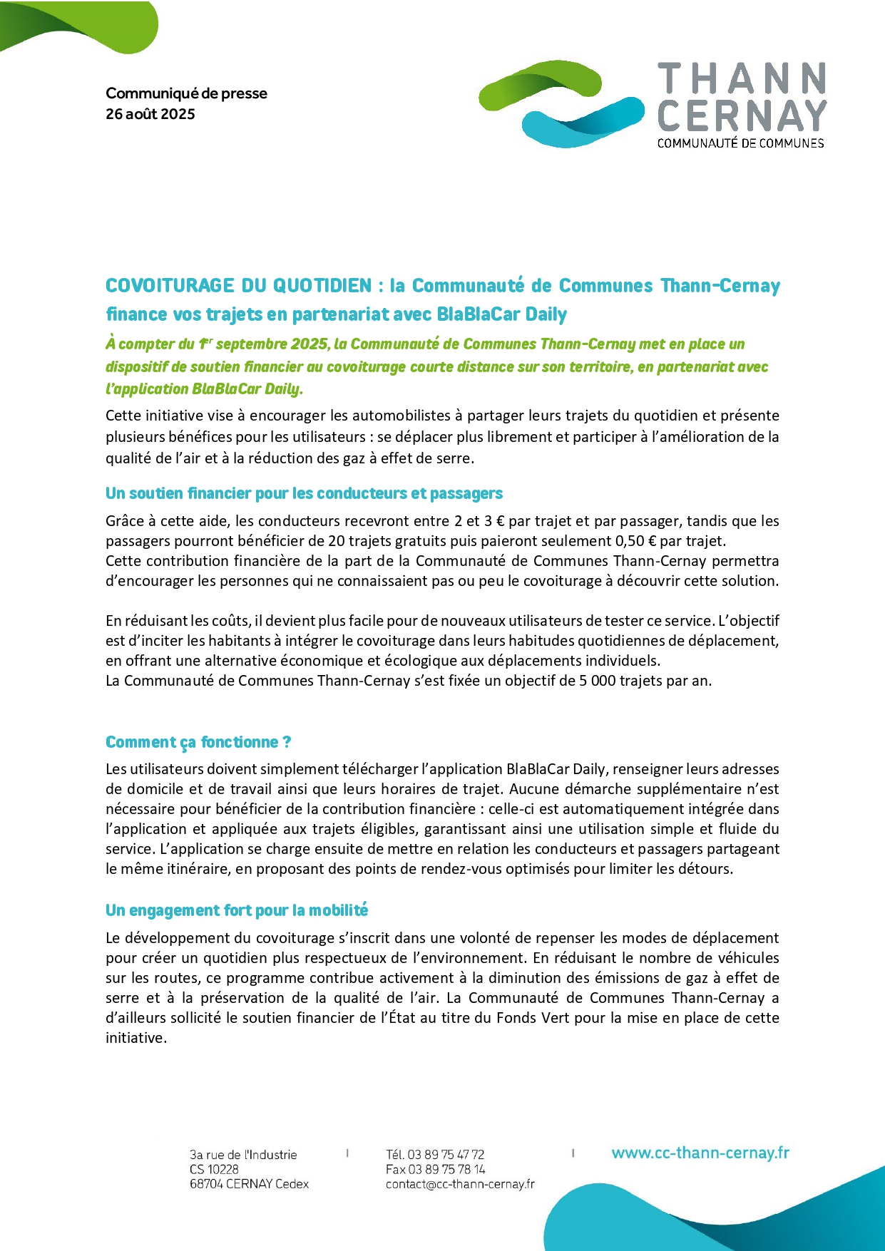 La Communauté de Communes Thann-Cernay finance vos trajets en partenariat avec BlaBlaCar Daily